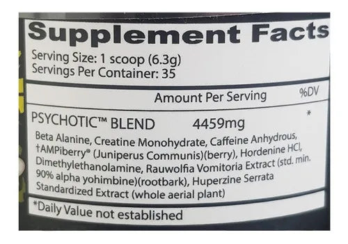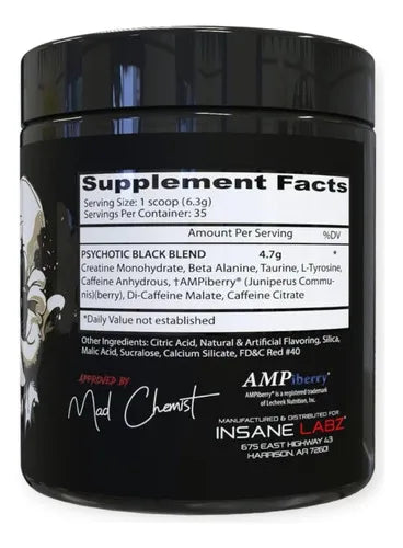 Psychotic Black Insane Labz is a 35-serving Fruit Punch-flavored supplement designed to complement your diet. It provides vitamins, minerals, proteins, and other essential components for proper body function. This product helps maintain balanced nutrition, which is especially important in fast-paced lifestyles where it can be difficult to meet all nutritional needs.