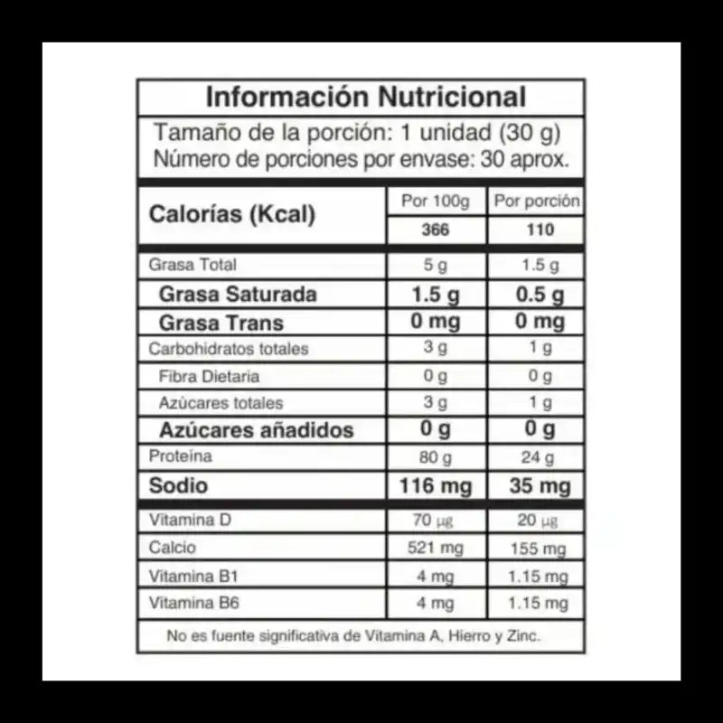 Proteína de suero 90%, Proteína de suero 80%, Suero desmineralizado, aroma (sabor artificial), L-leucina (fuente de aminoácidos), caseína, goma xantana (espesante), fosfato tricálcico (fuente de calcio), lecitina de soja (emulgente), dióxido de silicio AA-6P (antiaglomerante), Carboximetilcelulosa CMC (espesante), ácido ascórbico (fuente de vitamina C), sucralosa (edulcorante no calórico), Stevia (edulcorante no calórico), Vitamina B6 (piridoxina), Vitamina B1 (tiamina), Vitamina D.