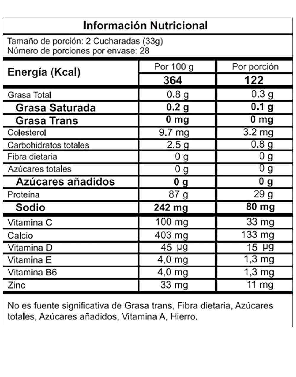 Ingredientes: Aislado de proteína de suero, sabor naturalmente idéntico (vainilla blanca), carboximetilcelulosa CMC (estabilizador), lecitina de soya (estabilizador), goma xantana (espesante), dióxido de silicio (antiaglomerante) (1000 mg/kg), citrato de zinc, vitamina C (ácido ascórbico), edulcorante natural (stevia), vitamina B6 (piridoxina), vitamina E, vitamina D; contiene: leche y soya.