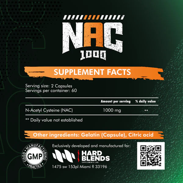 ¡El mejor antioxidante de nuestro cuerpo! El NAC, o N-acetil L-cisteína, es una forma del aminoácido cisteína, que desempeña un destacado papel antioxidante y desintoxicante en nuestro organismo. Por ello, HARDBLENDS te ofrece todas sus propiedades en la mayor concentración del mercado: 1000 mg por cápsula.
